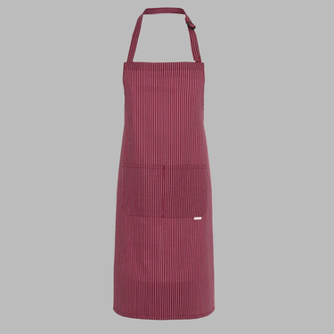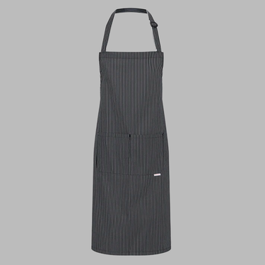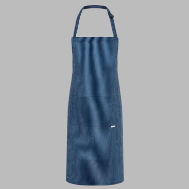 En slidstærk og stilfuld forklæde i twill-vævning (185 g/m²) med klassiske hvide nålestriber. Forklædet har justerbart nakkebånd, praktisk todelt lomme og forstærkede bindebånd – ideelt til både professionelle og private brugere.