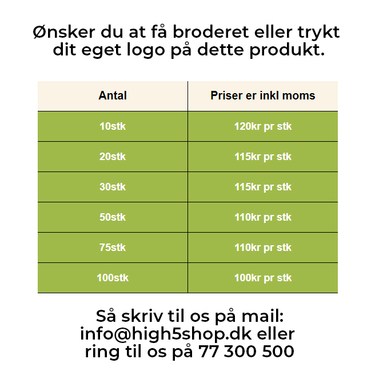 Efter I har lavet din bestilling modtager du indenfor 24 timer en mail fra os med de oplysninger vi skal have retur for at komme igang med at lave jeres ordre. Vi har brug for jeres logo, farvevalg samt størrelsesvalg.
