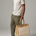 Denne Cotton Pocket Jute Shopper kombinerer holdbarhed, bæredygtighed og stil. Fremstillet af lamineret jute med en 100% bomulds canvas forlomme, er den både miljøvenlig og praktisk til daglig brug.