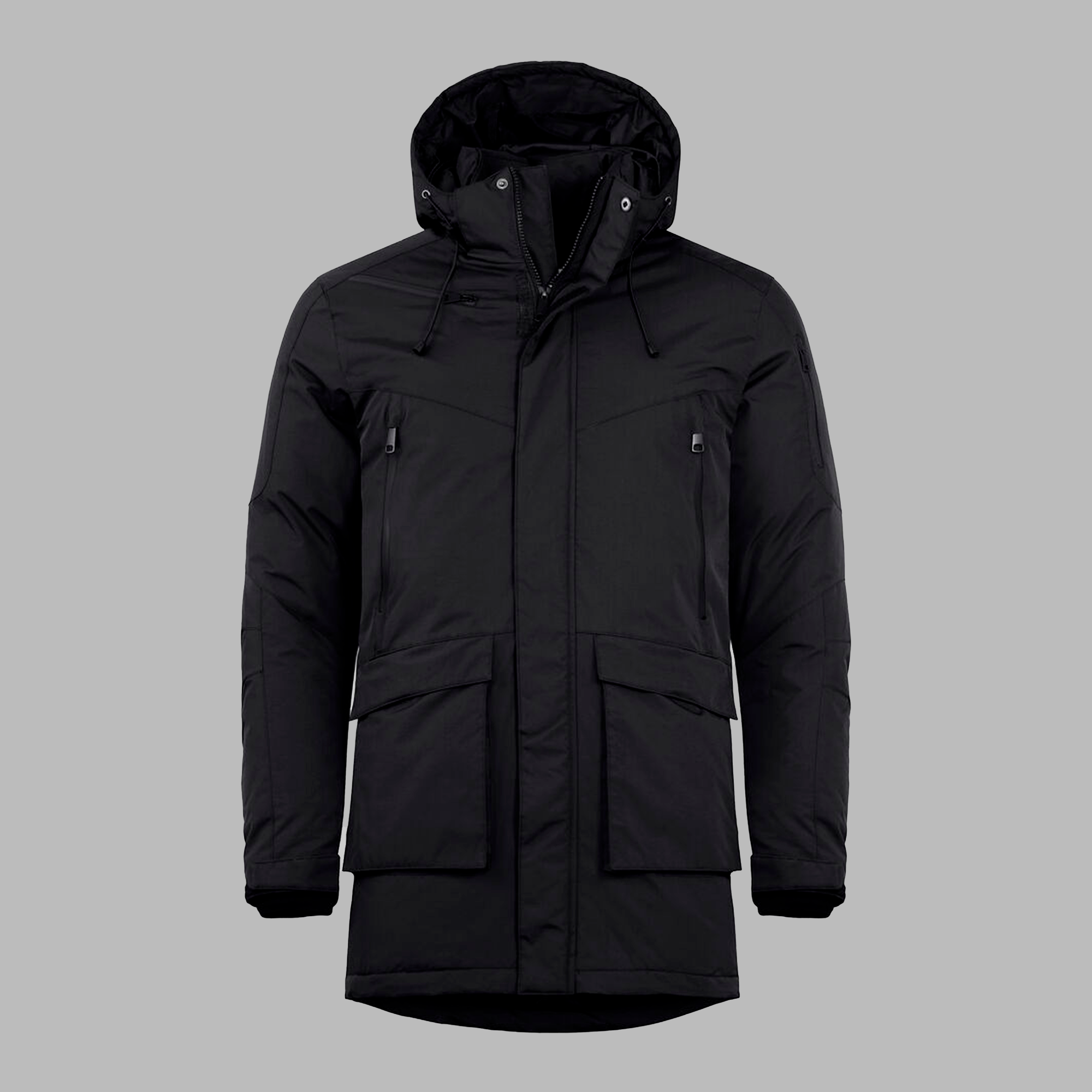 Kraftigt polstret unisex parka. Aftagelig og justerbar hætte. Forbøjede ærmer for at lette bevægelse. Fire udvendige lommer med vandtætte lynlåse og to udvendige lommer med magneter. En skjult sikkerhedslomme med en smart høretelefon løsning på indersiden. To indvendige lynlåslommer og to indvendige meshlommer. Løbegang i talje og forneden. Manchetter med justerbar velcro med indvendig 2x2 ribmanchet. Lynlås i foret for nem adgang til påsætning af logo.