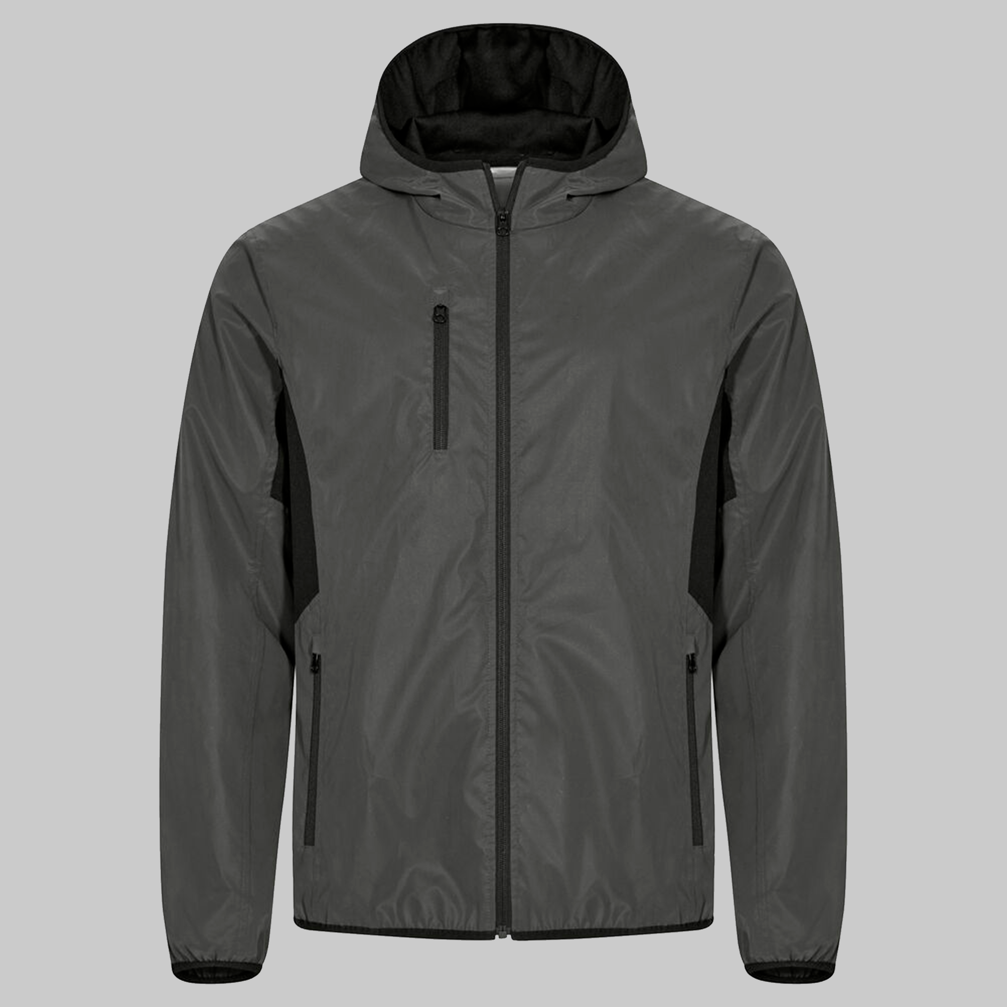 Funktionel refleks vindjakke med hætte. Bird eye for i hætte og armhule for øget komfort og åndbarhed. 3 udvendige lommer med lynlås og 2 inderlommer. Kontrasttape omkring hætte forneden og i ærmeender.