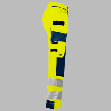 Taljebuks til dame. To aftagelige hængelommer til søm, en med ekstra lommer og en med stropper til værktøj. Sømlommer er forstærkede med 100% Cordura®. Dobbelt lag stof over låret. Lårlommer med mobillomme, lomme til pen, holder til ID-kort og værktøjslomme. To regulerbare loops til hammer. To D-ringe. Lomme til tommestok med værktøjslomme og knivknap. Forstærkning i polyamid på knæ, indvendig åbning og regulerbar højde af knæbeskyttere. Ergonomisk tilpassede knæ. Forstærket med polyamid længst nede bagerst på benene. Ekstra brede baglommer.