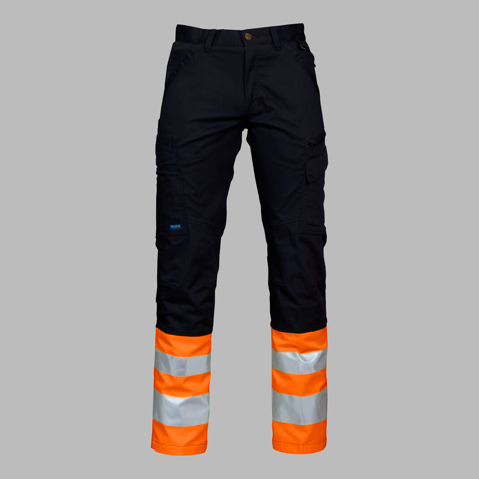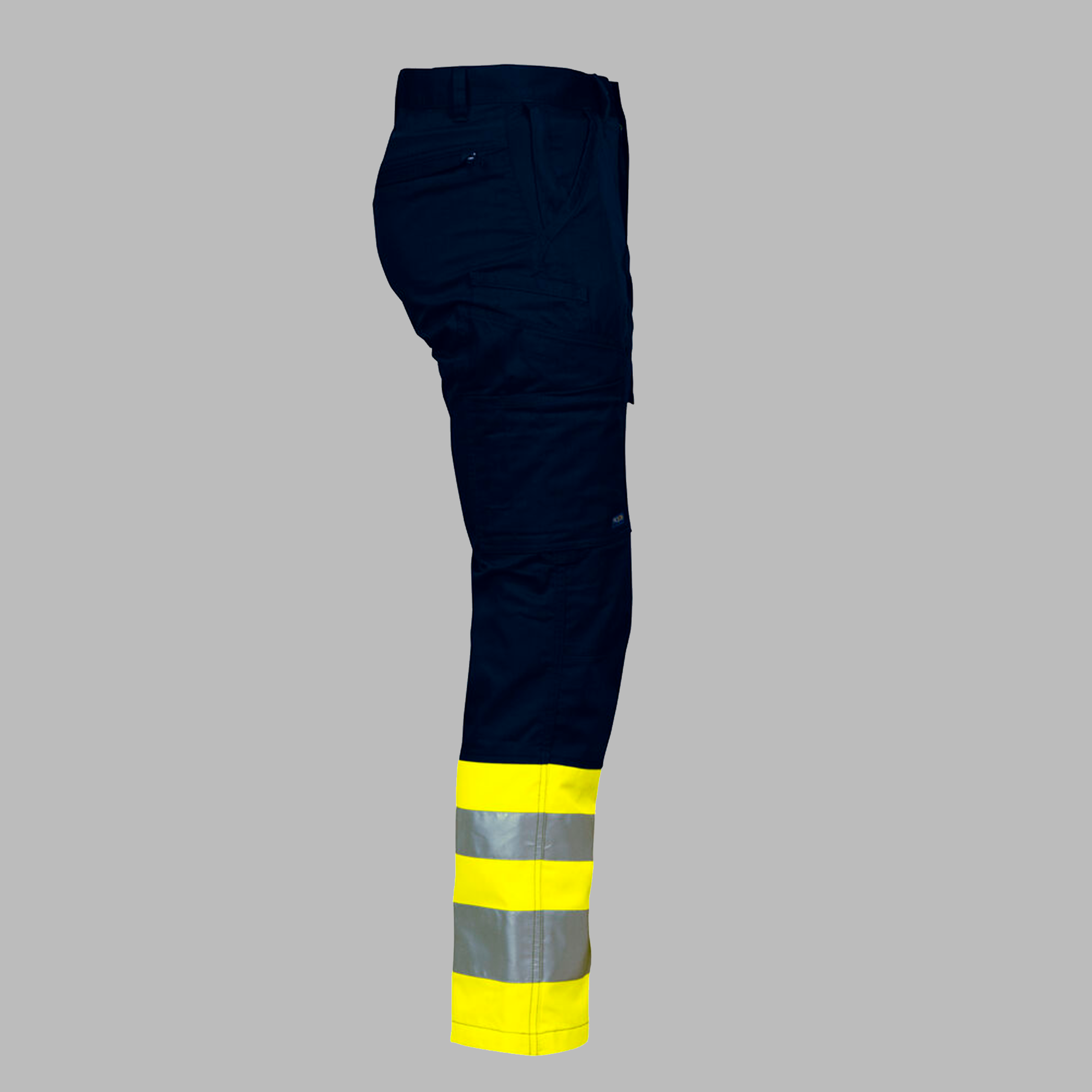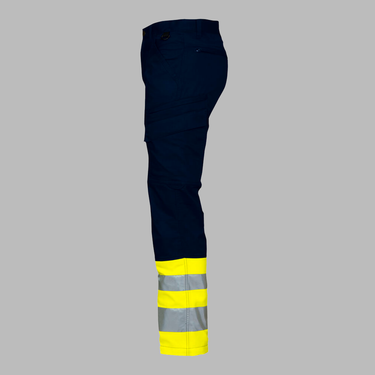 Taljebuks uden læg foran. Sidelommer foran, sikkerhedslomme med lynlås på højre side og nøglelomme med D-ring på venstre. To baglommer. To lårlommer. Venstre lårlomme har flap og indvendig mobillomme, D-ring til ID kort holder og en lomme med lynlås. Højre lårlomme har plads til mobiltelefon, kuglepenne, papirer og tommestok. Indvendige knælommer. Strop under baglomme og lårlomme til montering af inbags.